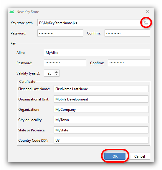 - Select a path and provide the required information as shown in figure. * Your key should be valid for at least 25 years and up to 999 years, so you can sign app updates with the same key through the lifespan of your app. * The passwords can be the same for the key store and for the key, do not forget it. * You can find your country’s code at the following link (use Alpha 2 “A2” codes): http://kirste.userpage.fu-berlin.de/diverse/doc/ISO_3166.html.